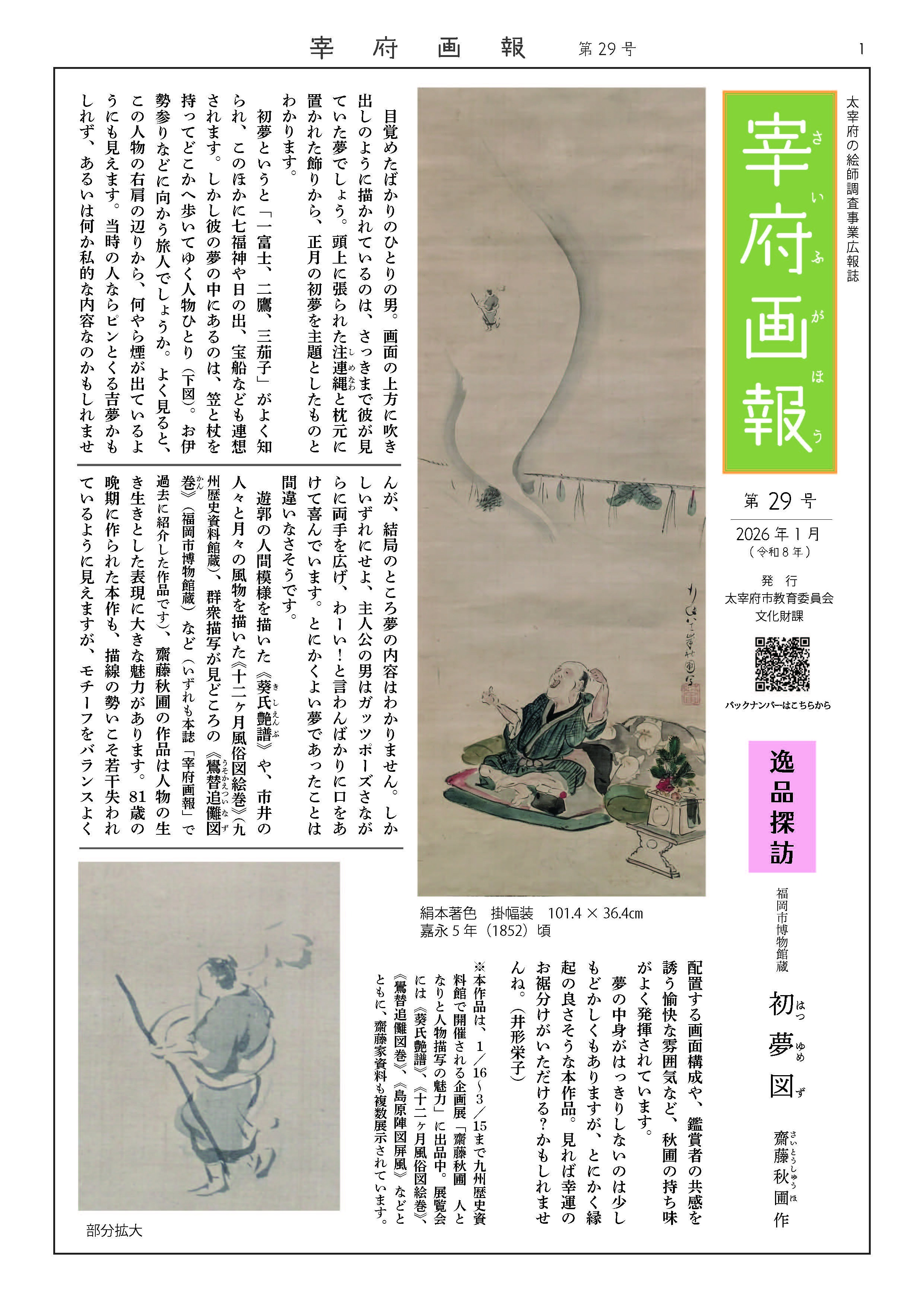 市文化財課では、平成26年から、近世~近代に活躍した太宰府の絵師の調査を行っています。その成果を発信し、かつて太宰府で活躍した絵師について多くの方に興味・関心を持っていただけるよう、広報誌『宰府画報(さいふがほう)』を刊行しています。