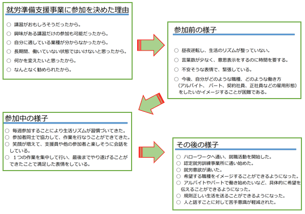 就労準備支援事業とは、一般就労に向けた準備が整っていない方を対象に一般就労に従事する準備としての基礎能力の形成を計画的かつ一貫して支援する事業です。