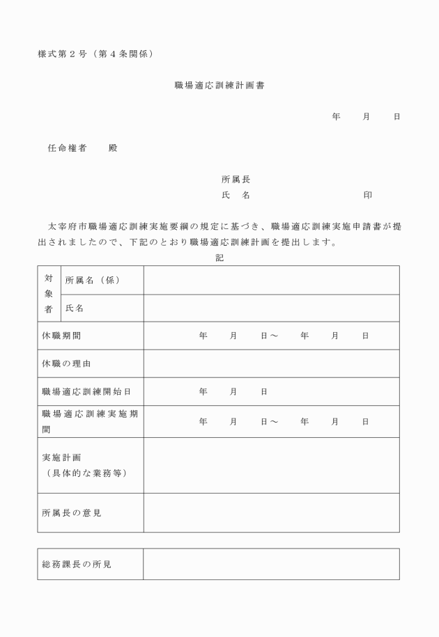 第4条 適応訓練の申請に当たっては、当該職員は、適応訓練に関して主治医による所見を記載するとともに、太宰府市職員健康管理規程(平成2年訓令第1号)第10条の規定に基づき選任された産業医(以下「産業医」という。)と面談のうえ、職場適応訓練実施申請書(様式第1号)を所属長に提出するものとする。